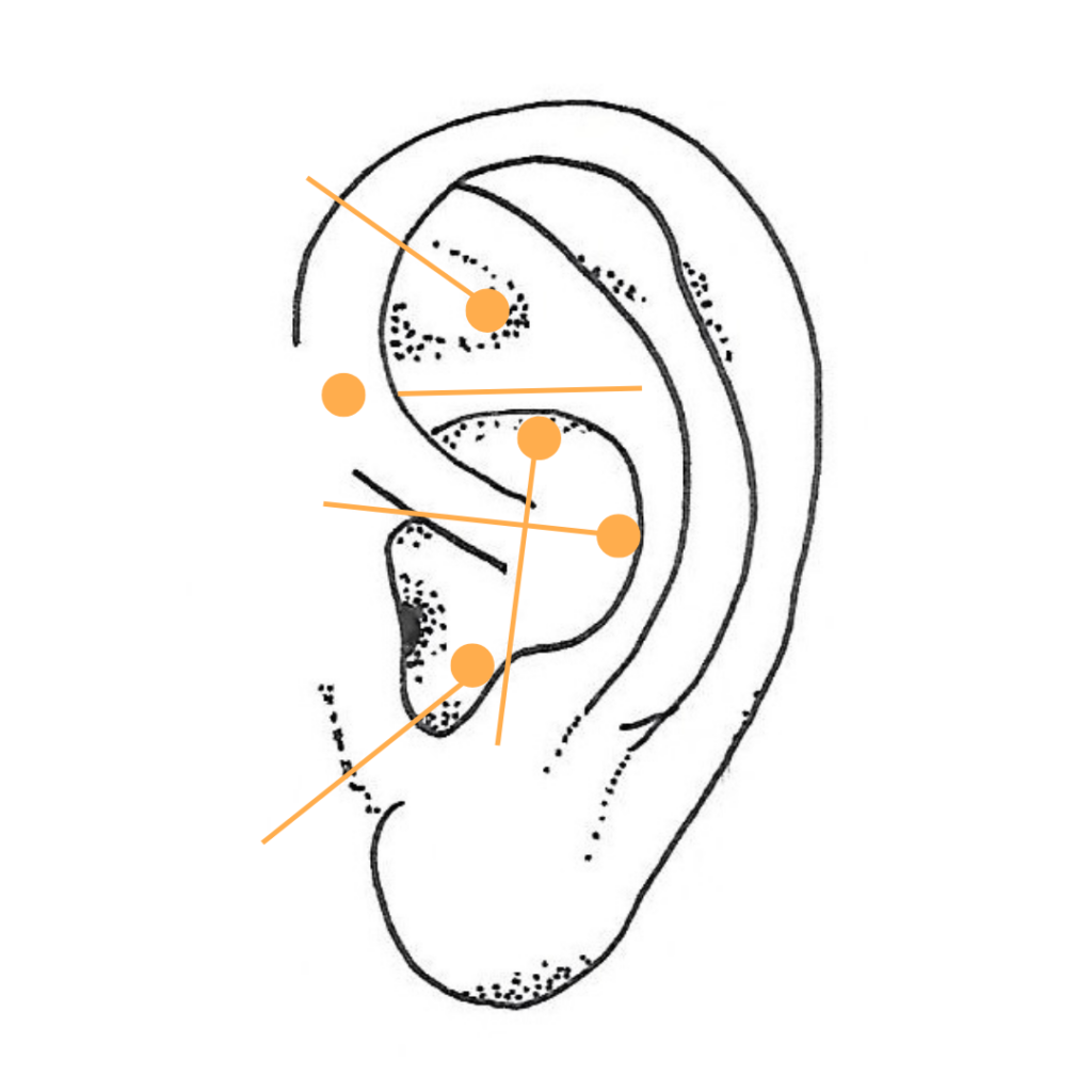 Der sættes 5 små sterile nåle i hvert øre. Altså 10 i alt.