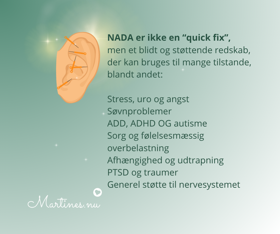 NADA er ikke en “quick fix”, men et blidt og støttende redskab, der kan bruges til mange tilstande, blandt andet: